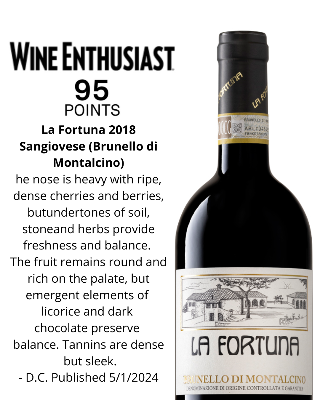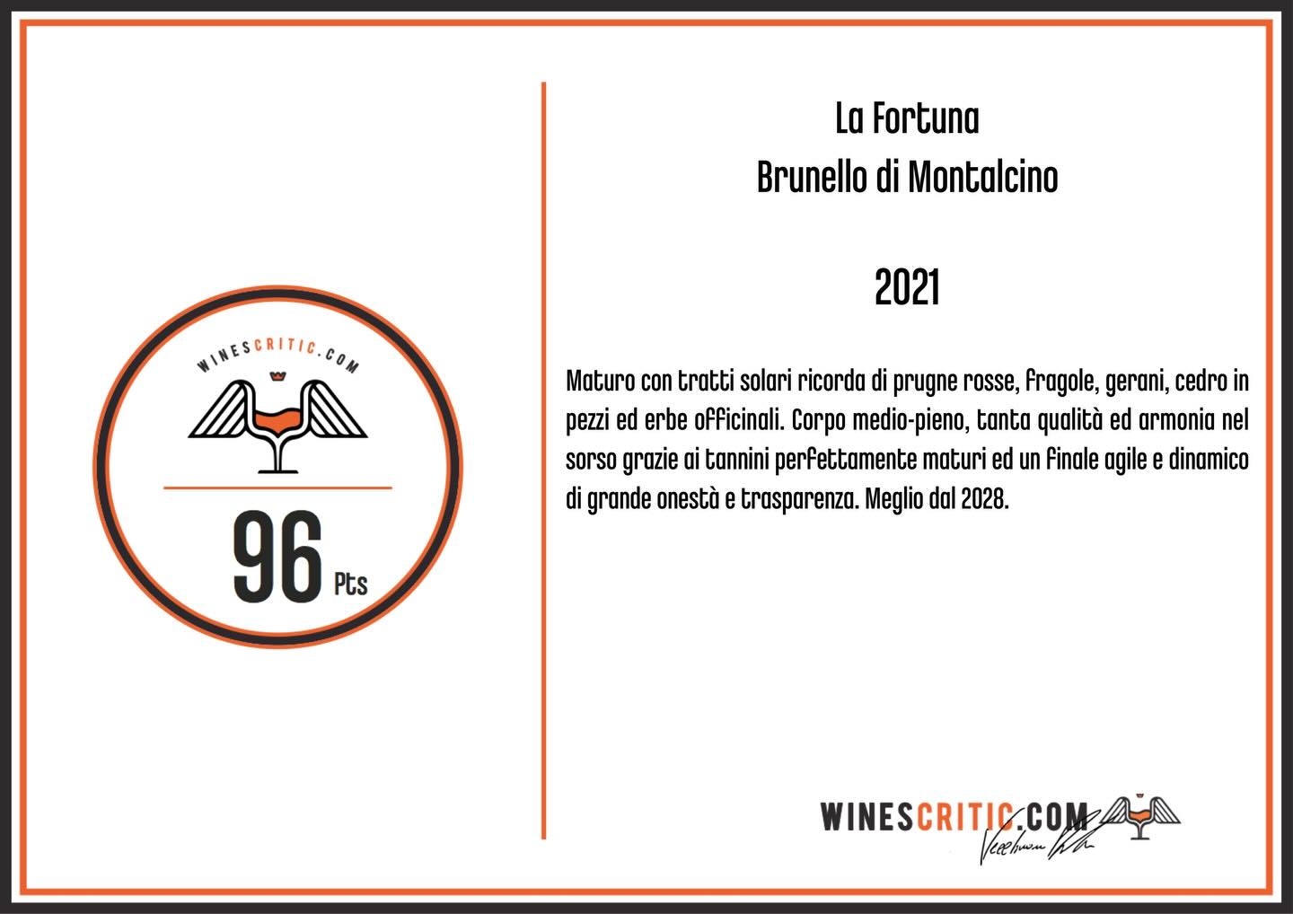Il Brunello "La Fortuna" è un vino di grande impatto ed estrema concentrazione, al naso impetuoso è il frutto ed eleganti le note balsamiche e speziate, molto corrispondente al terroir, dove la potenza è equilibrata dalla componente acido/tannica che permette una bella progressione e persistenza.